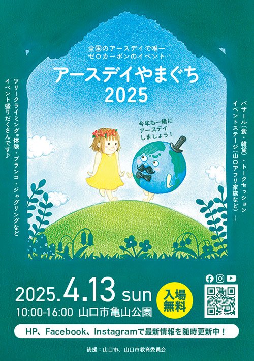 アースデイやまぐちは全国でも唯一、ガソリンを一滴も使わないゼロカーボンのイベントです。化石燃料の発電機を使わず、会場にEV(電気自動車)3 台 + ソーラー発電できるE トレーラーを設置し、太陽光で発電して貯めた電気を使用しています。未来の地球の主役である” 子ども達” に快適なイベントを目指しています。EV を見つけたら、ぜひ近づいてみてください。供給中も排気ガスが出ないので、小さなお子さんが近づいても安全で、耳を澄ますと鳥の声が聞こえるくらい静かです。亀山公園の春を感じてください。奇跡の星、地球に感謝ですね。地球に良いことで、自分たちにも良いこと、一人ひとりが今住んでいるところでできること、未来のためにできることから、みんなで一緒にアースデイしましょう!